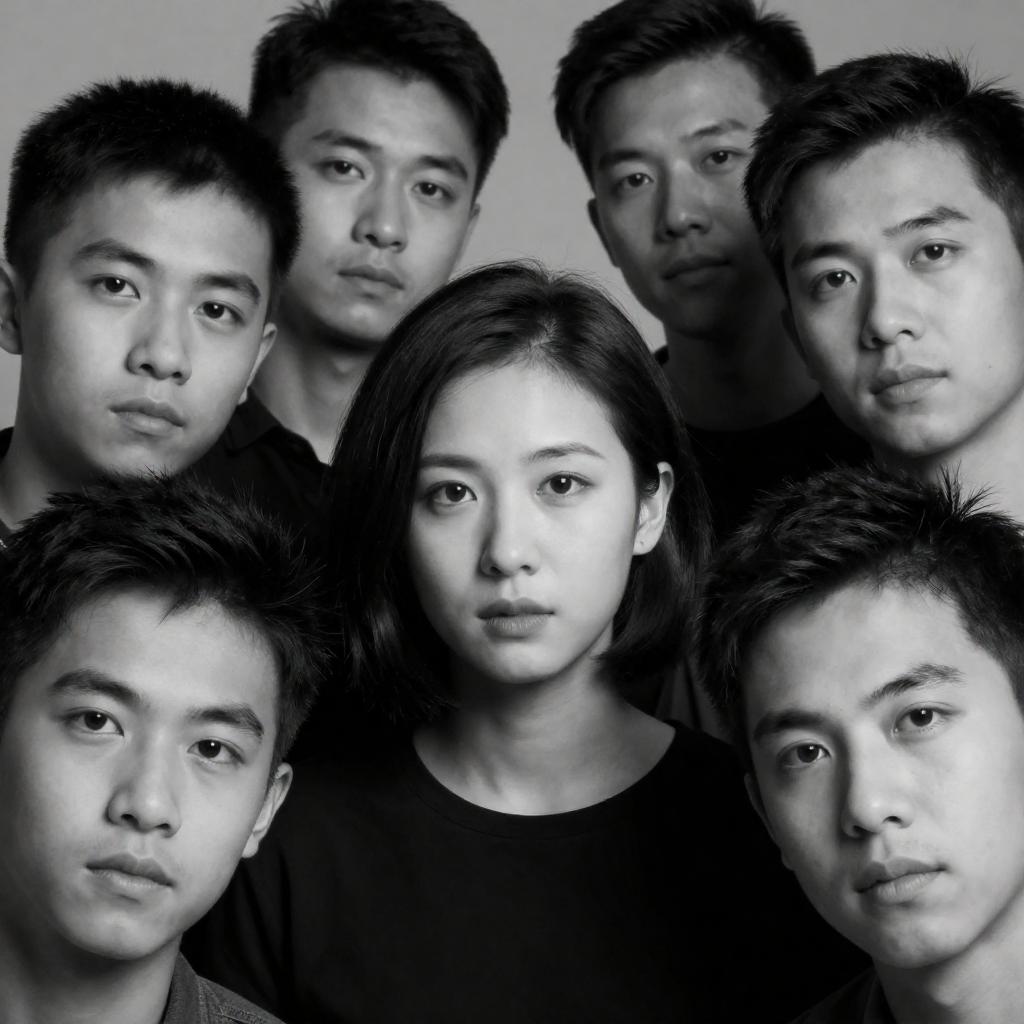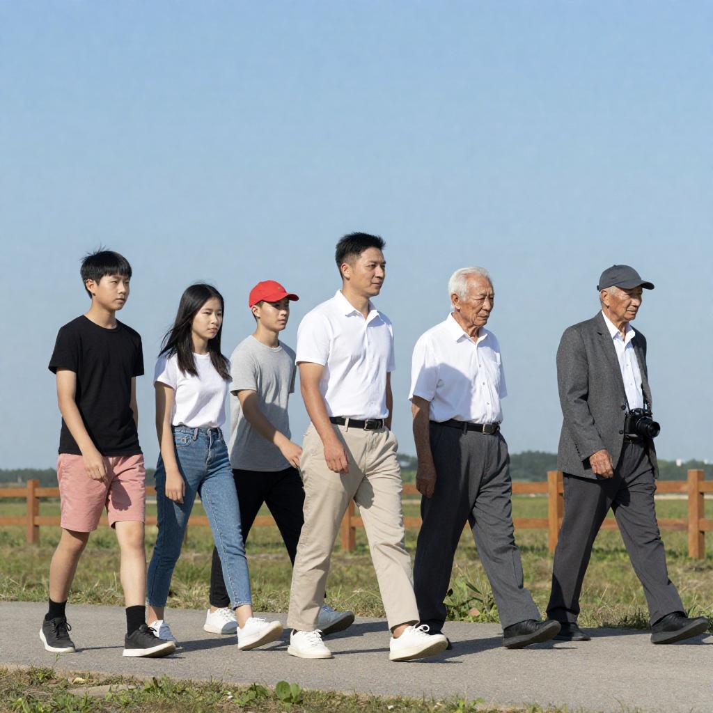 Photograph of six young adults walking down a forest path. A man in a navy shirt and jeans walks closely with a woman in a black top and green pants, his arm around her. Four others, two men in t-shirts and two women in casual clothes, follow behind. The background features blurred trees and a dimly lit path.