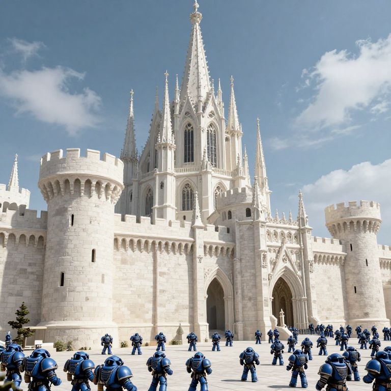 White Cotton Massive Gothic fortress with towering walls, imposing spires, and heavily armed defenders, housing the armies of the Imperium.,