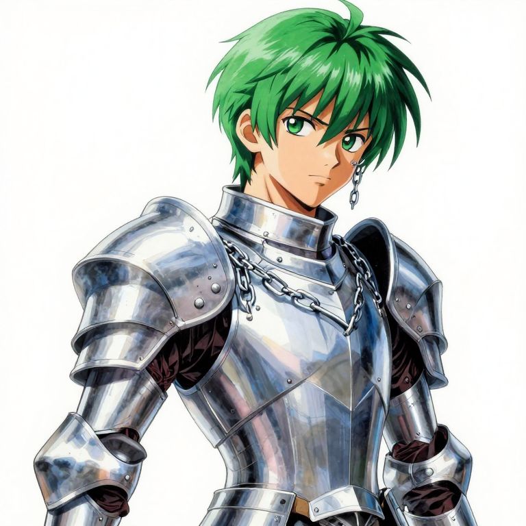 Perception Andromeda no Shun, bautiful boy, cute, green hair, chain, silver armor saint, style of hajime sorayama, acrylic and spraypaint, fine details.,