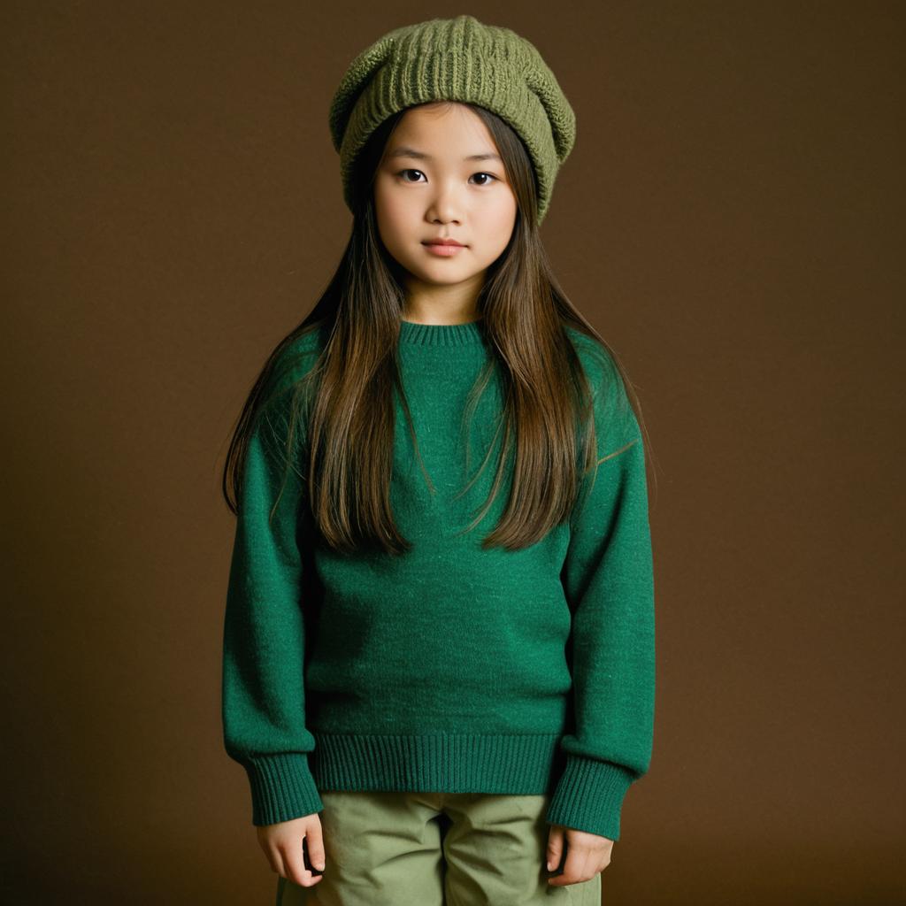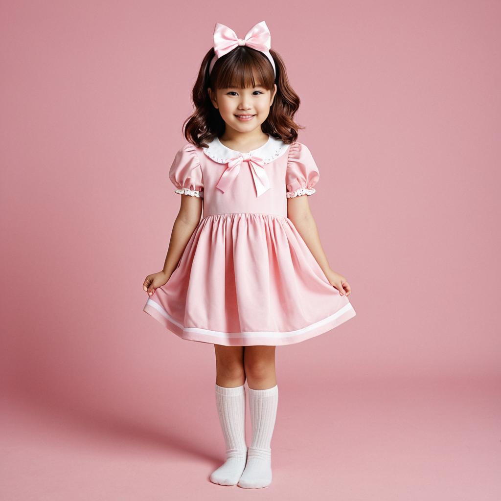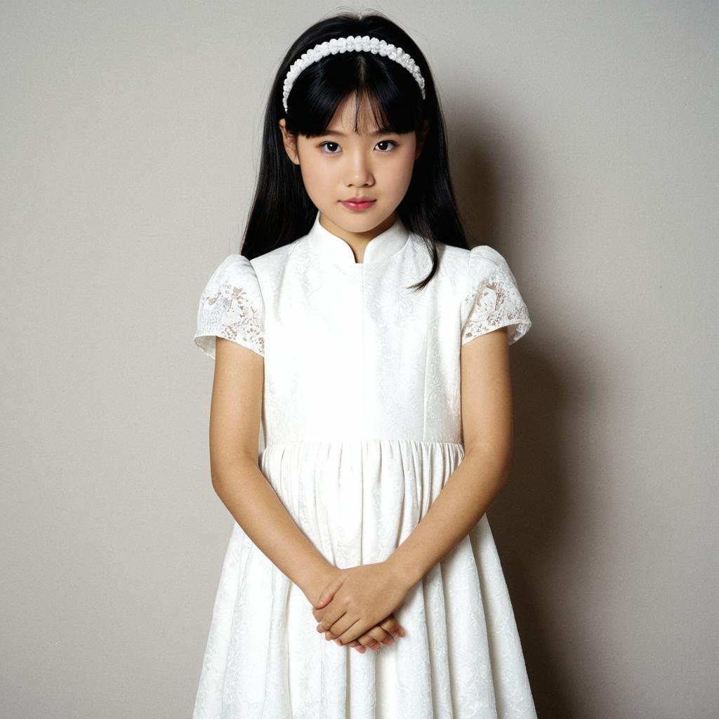 Portrait of a young Asian girl standing against a neutral background, wearing a white communion dress with lace short sleeves and a floral pattern. She has long black hair adorned with a white beaded hairband and brown eyes, looking directly at the viewer with hands gently clasped together.