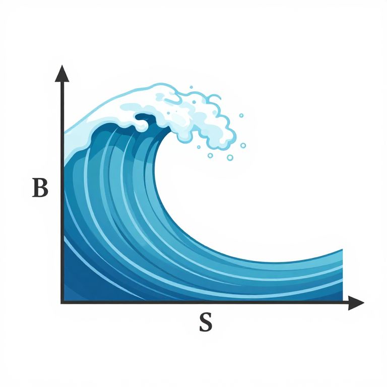 This is a digital illustration of a stylized ocean wave, depicted in a semi-abstract, cartoon-like style. The wave is colored in gradients of blue, starting from dark blue at the bottom and transitioning to lighter blue at the crest. It forms a semi-circle shape, with a white foamy crest at the top. The wave is set against a white background, and a coordinate grid is overlaid on the image. The grid has labels "B" at the bottom left, "S" at the bottom right, and an arrow pointing upwards to the left. The grid helps to provide a geometric perspective of the wave's shape and structure.