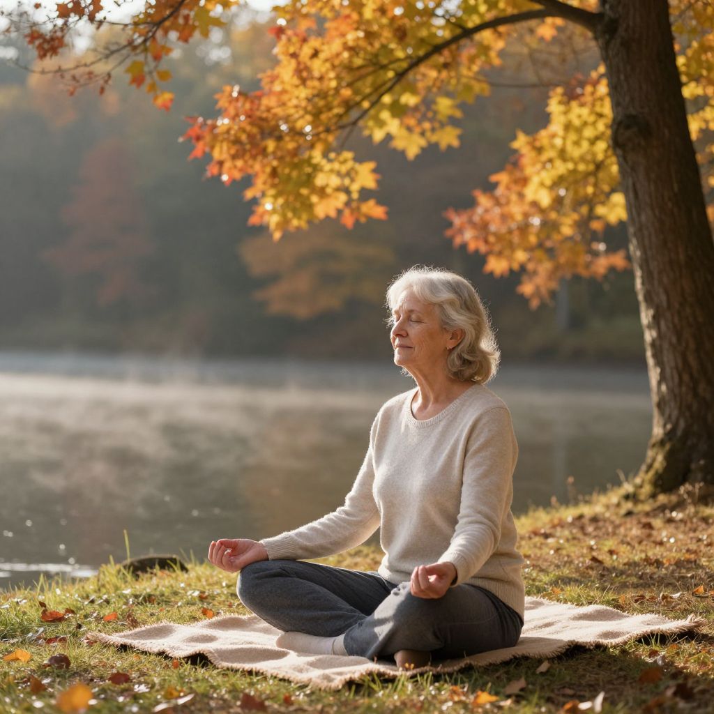 Elderly woman meditating peacefully outdoors, seated cross-legged on a blanket near a serene lake, surrounded by vibrant autumn foliage and soft morning light filtering through the trees.