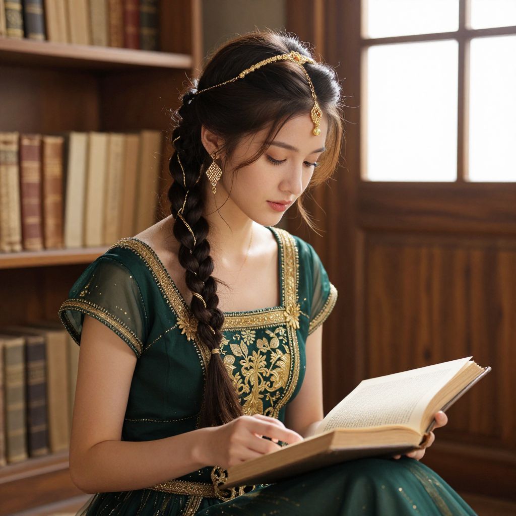 Photograph of an elegant Asian woman with long braided hair, wearing a green and gold embroidered dress, reading in a sunlit library.