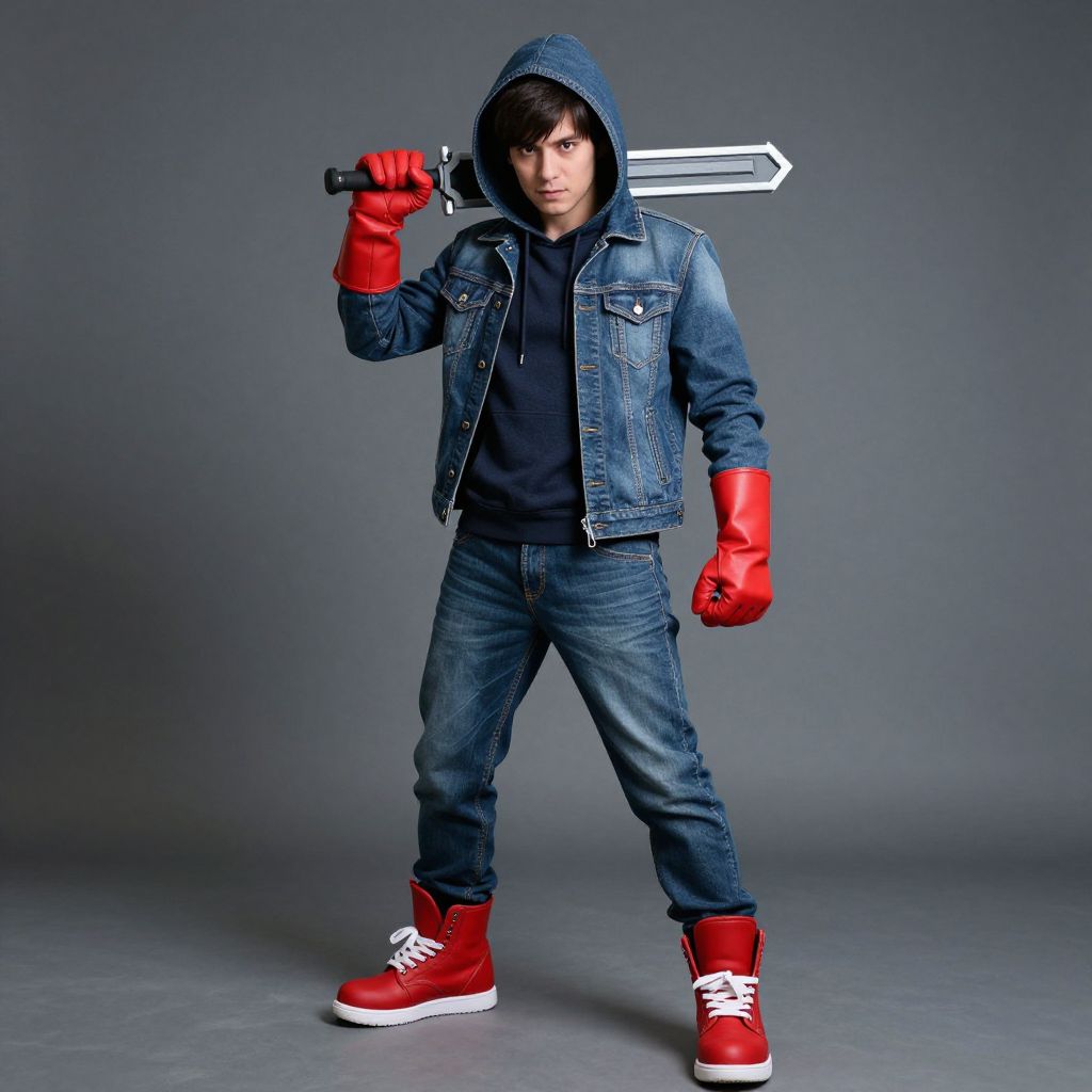 Photograph of a young man in a superhero pose, wearing a blue denim jacket with a hood, red gloves, blue jeans, and red sneakers with white laces. He has dark hair and a serious expression, holding a double-edged sword over his right shoulder with his left hand. The background is a plain gray studio with soft lighting. The man's outfit and accessories give a comic-book-inspired look, with the red and blue colors standing out prominently against the gray backdrop.