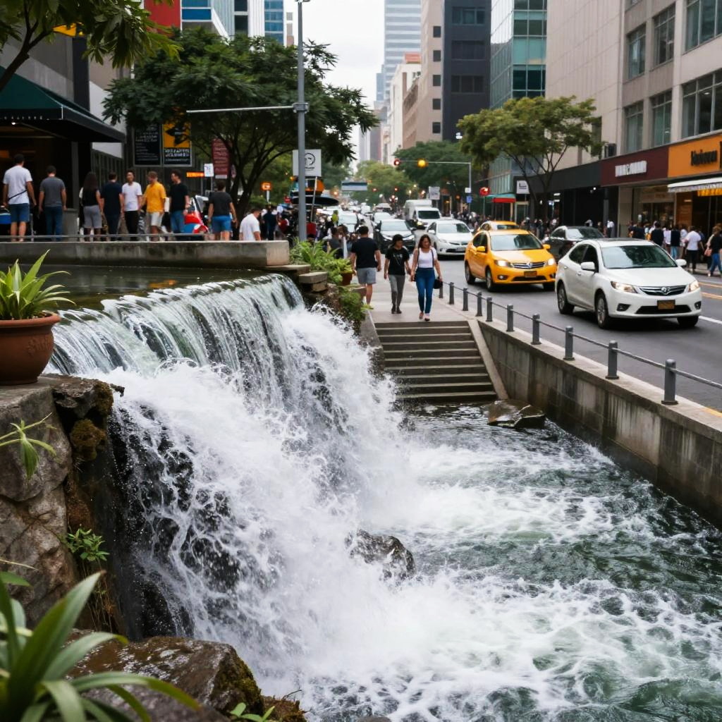 Photo blending of a waterfall cascading into a bustling urban street, combining natural elements with modern architecture, vibrant and dynamic composition with realistic textures and dramatic lighting, evoking contrast and coexistence.