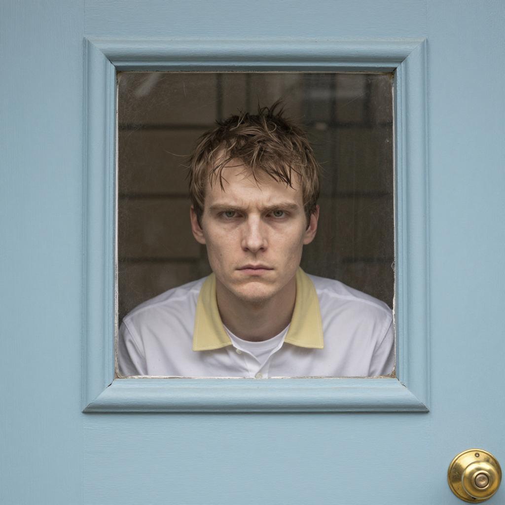 Man with fair skin and light brown hair, wearing a blue striped shirt, red suspenders, and a blue patterned tie, sits in an office chair. Background: vertical white blinds, office desk with a clock, a metal ashtray, and a glass. Bright light from the window. Intense facial expression.