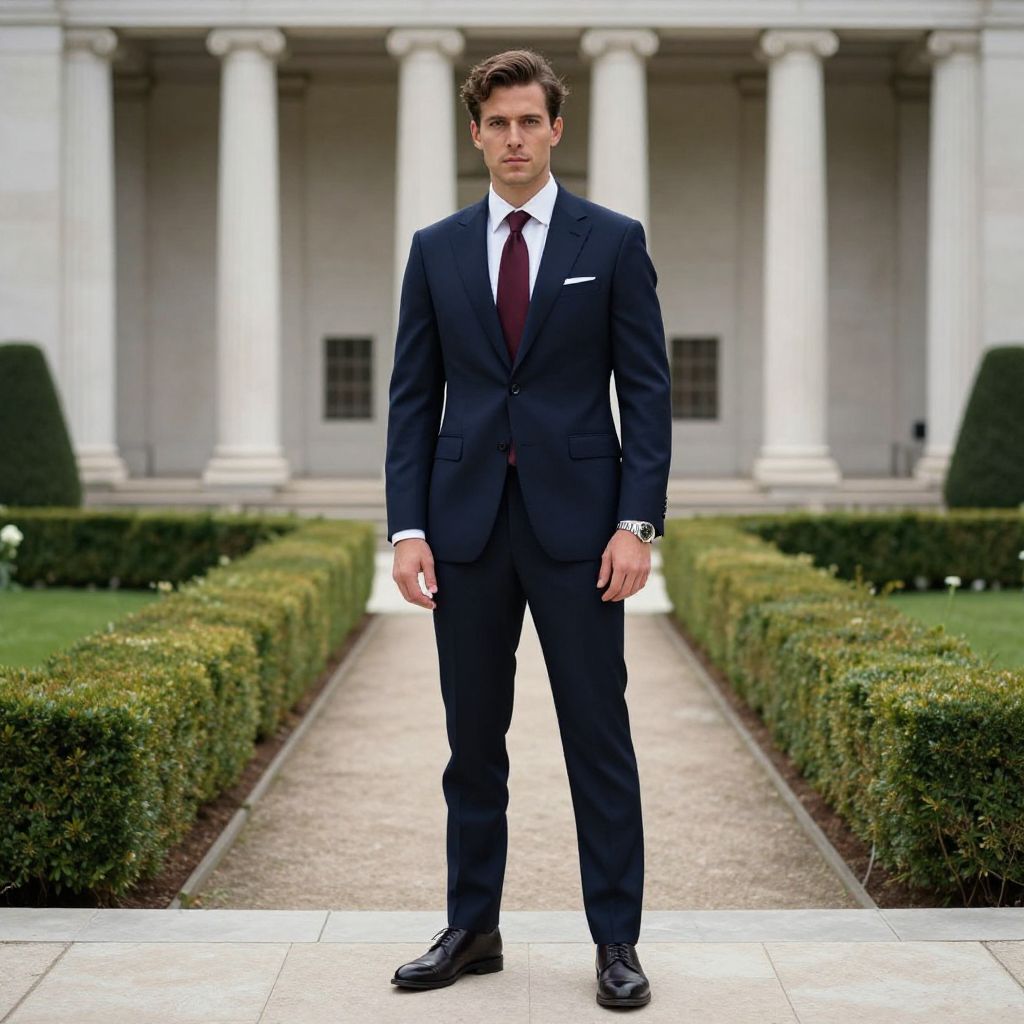 A man, navy tailored suit, crisp white dress shirt, deep burgundy silk tie, leather oxford shoes, stainless steel dress watch, neoclassical façade, towering columns, manicured gardens, pinhole camera style, confident expression. Man has masculine face and piercing eyes