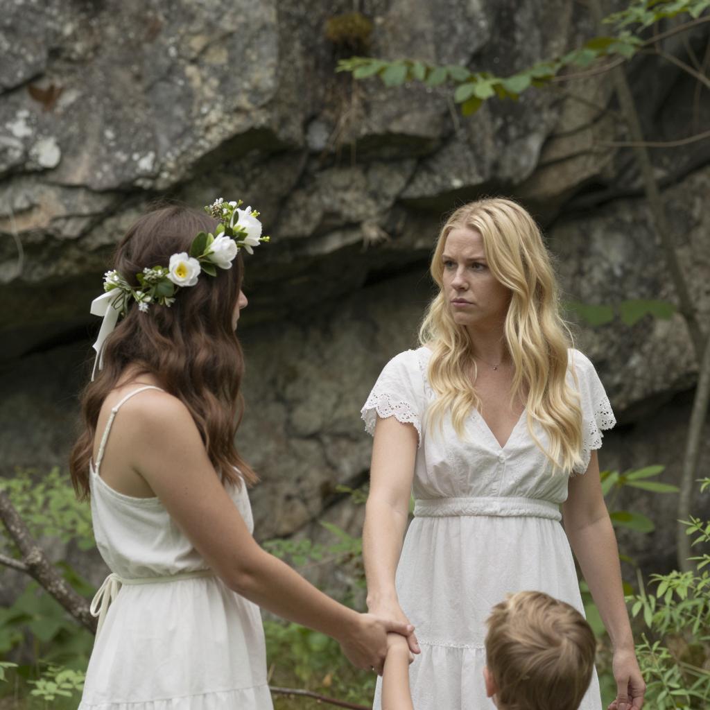 Photograph of a forest scene with three people. Blonde woman in white dress pulls brunette woman wearing white with flower crown, who is holding child's hand. Rocky cliff and greenery in background. Woman's face shows determination, child's face is not visible.