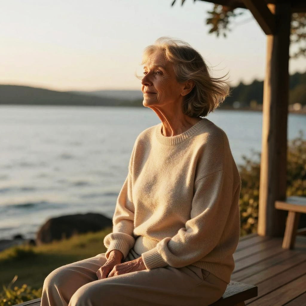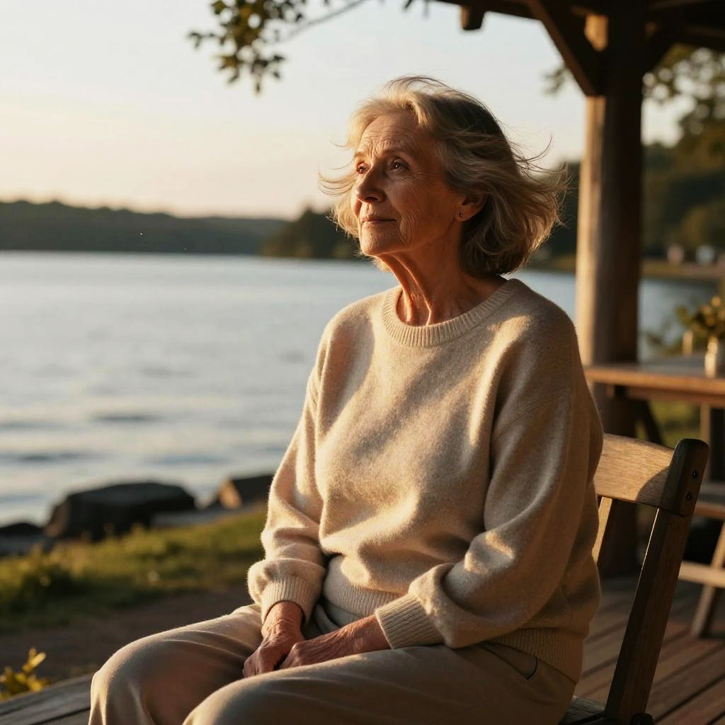 Photograph of an elderly woman with short, windswept gray hair, sitting on a wooden porch by a lakeside at sunset. She wears a light beige, knitted sweater and beige pants, with sunlight casting a warm glow on her face. Her expression is contemplative as she gazes into the distance. The background shows a serene lake with gentle waves, blurred trees, and a wooden house with a window and potted plant on the porch. The image captures a peaceful, reflective moment with soft, golden lighting.