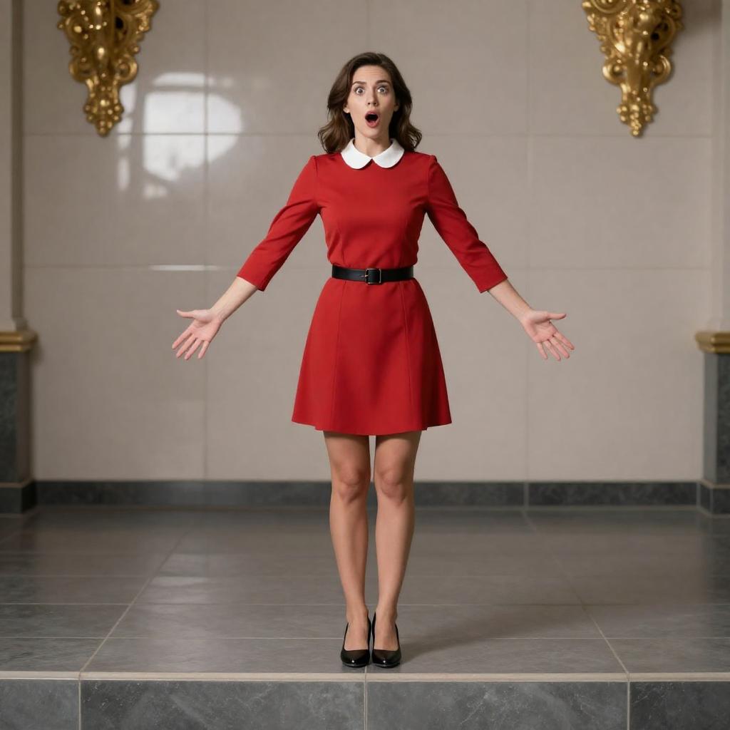Woman with brown hair, red dress with white collar, black belt, black shoes, and short skirt, standing on gray tiled platform, arms outstretched, mouth open in shock. Background features reflective tiles and gold ornate decorations. She is centered, legs apart, with a startled expression. Indoor setting, modern design.