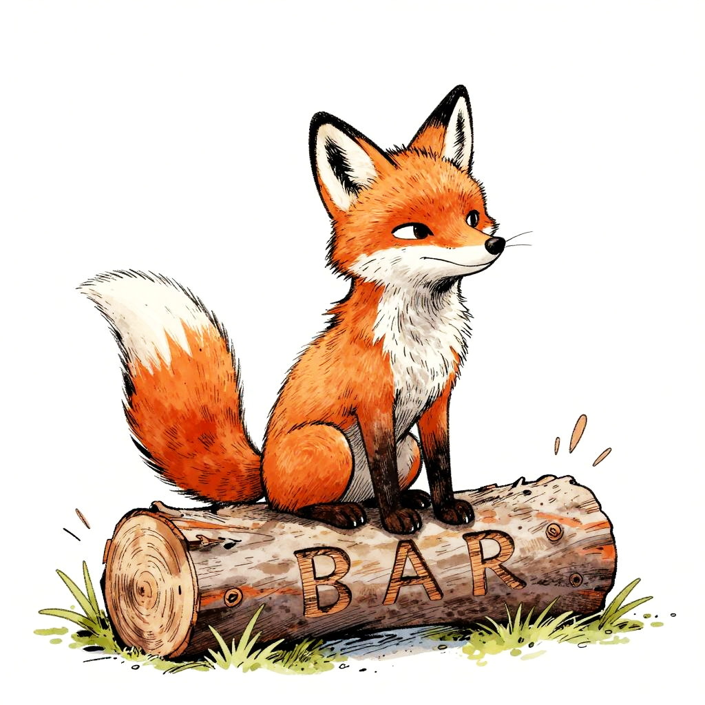 A whimsical illustration of a fox sitting on a log with carved initials, hand-drawn cartoon style; dynamic, expressive linework with varied thickness; soft watercolor washes over detailed ink outlines, textured brushstrokes; fine cross-hatching and stippling techniques; isolated on a white background.