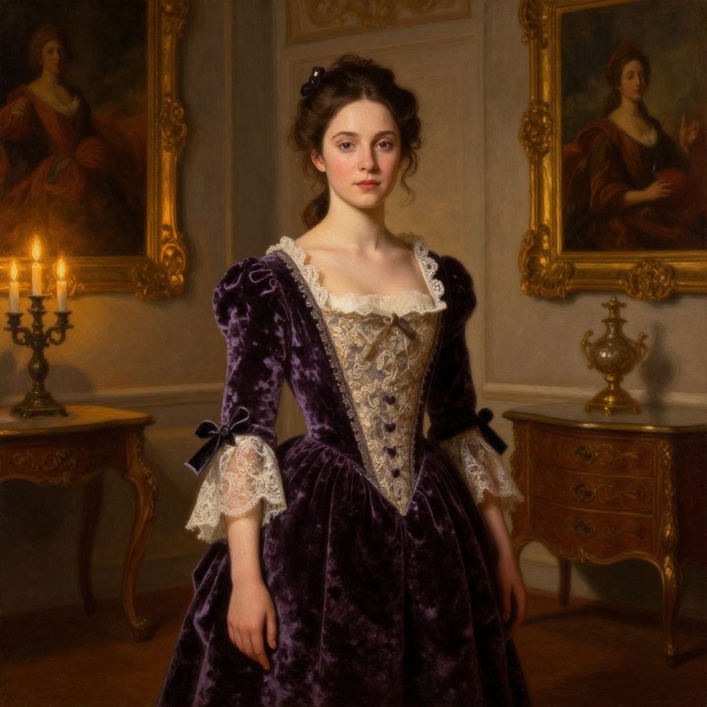 Photograph-style digital artwork of a pale-skinned, dark-haired woman in a Victorian-style, dark purple velvet gown with lace trim, standing in a