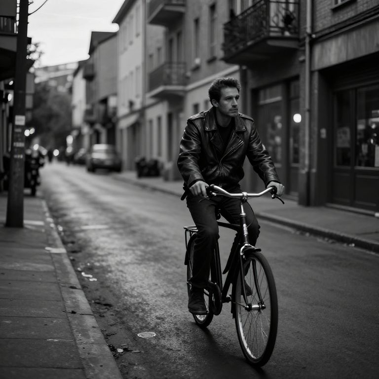 A gritty urban street scene at dusk, featuring a lone cyclist in a worn leather jacket navigating city alleys, photographed in grayscale with high contrast and exposed shadows, evoking a mood of quiet resilience and urban solitude.