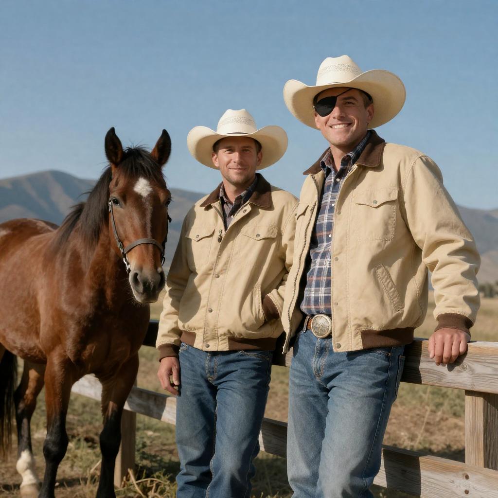 Photograph of two men standing on a rustic porch. The man on the left wears a white hat, red plaid shirt, blue jeans, and tan boots, holding two metal rods. The man on the right wears a beanie, worn shirt, and jeans, holding a metal ladder. Wooden porch with chairs, shelves, and hanging items in the background. Sunlight casts shadows. The man on the left looks down, while the man on the right gazes at him.