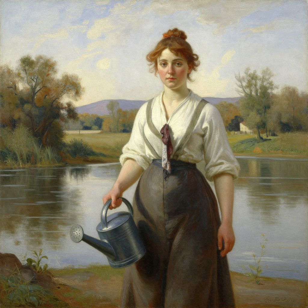 Realistic painting of a young woman in white blouse, blue knee-length pants, holding a metal watering can by a serene lakeside.