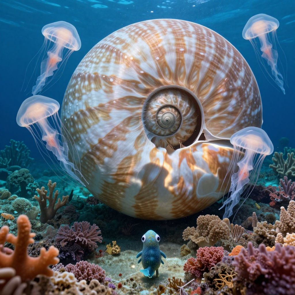 Imagine an enchanting underwater scene reminiscent of Haeckel's exquisite biogenic illustrations, where a grand nautilus shell becomes the setting for an entrancing ballet. A group of shimmering jellyfish elegantly twirl around the shell, their translucent bodies casting captivating shadows on the colorful coral reef below. From the viewpoint of a curious marine creature gazing through the spiral opening of the nautilus, witness this surreal gathering that artfully combines allure and intrigue, evoking an emotional spectrum ranging from serenity to amazement as the audience becomes engrossed in this mesmerizing aquatic display.