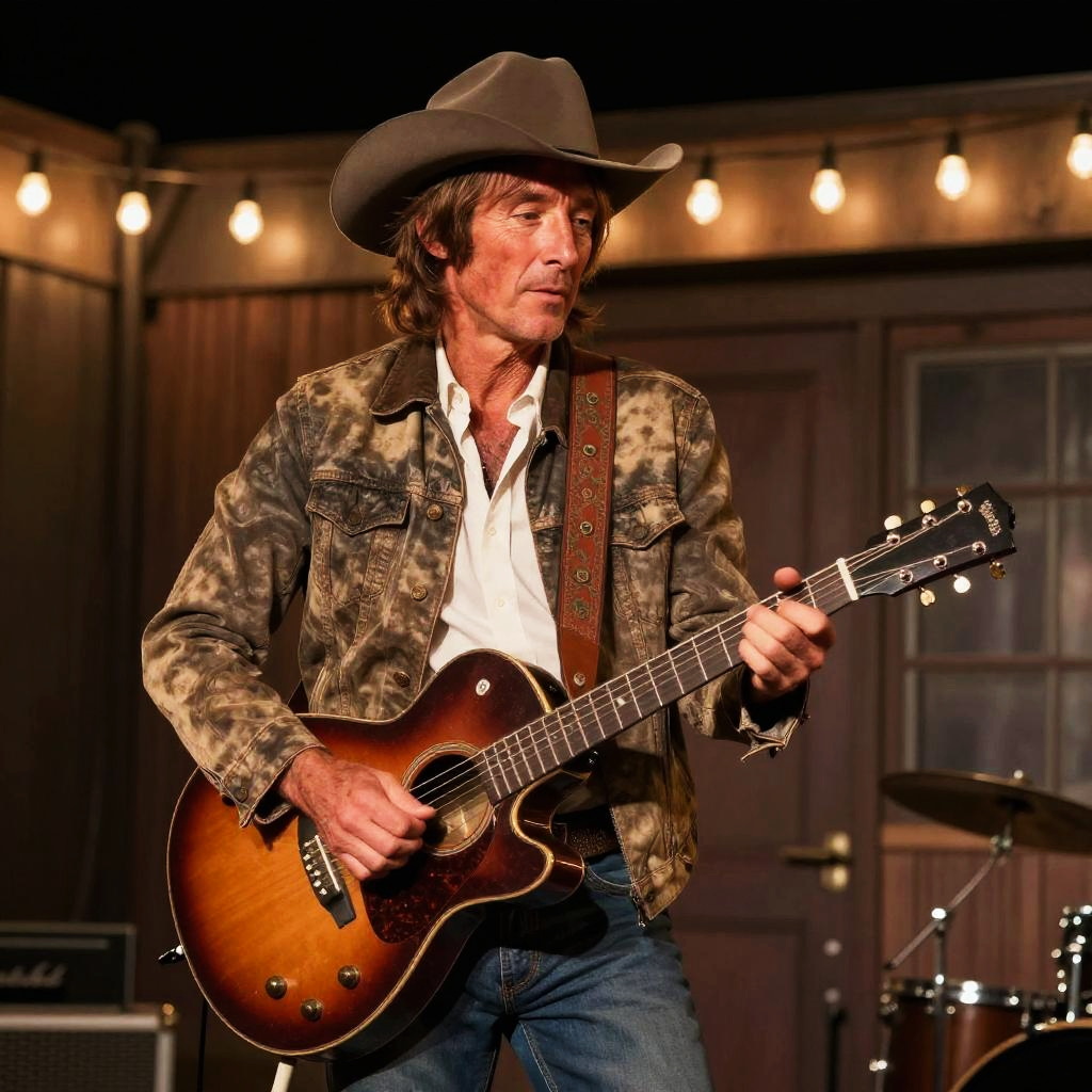 Photograph of a middle-aged man with long brown hair, wearing a cowboy hat, camouflage jacket, and white shirt, passionately playing a sunburst acoustic