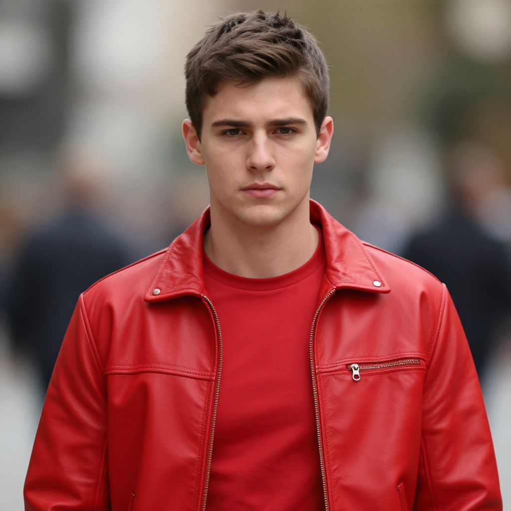 "retro outfit male, 1boy, male focus, solo, jacket, shirt, blurry background, belt, blurry, hands in pockets, brown jacket, jewelry, black shirt, realistic, outdoors, pants, necklace, open clothes, looking at viewer, short hair, open jacket, brown hair, leather jacket, facial hair, brown pants Realistic photo of casual sexy person with pretty face"