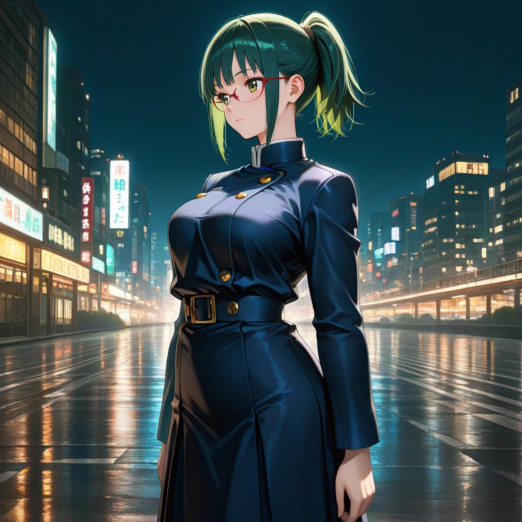 1girl, cowboy shot, beautiful, zenin_maki, ponytail, glasses, bangs, green hair, brown eyes, outdoors, jujutsu_uniform, night, city, volumetric lighting, best quality, masterpiece, intricate details, tonemapping, sharp focus, hyper detailed, trending on Artstation