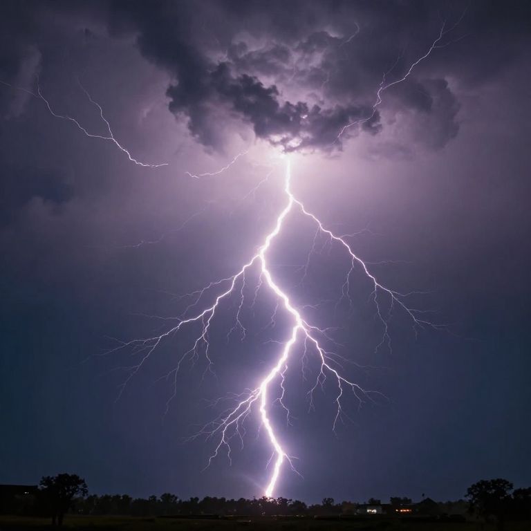 Photograph of a dramatic nighttime landscape featuring a bright, jagged lightning bolt striking through dark, stormy clouds. The lightning illuminates the scene with a stark white light, contrasting against the deep purples and blacks of the clouds. Below, rolling green hills with scattered trees and small, distant houses are visible. The foreground includes silhouetted plants. The overall atmosphere is intense and dynamic, with the lightning serving as the focal point against the dark, moody sky and serene, rural landscape.