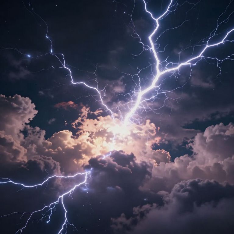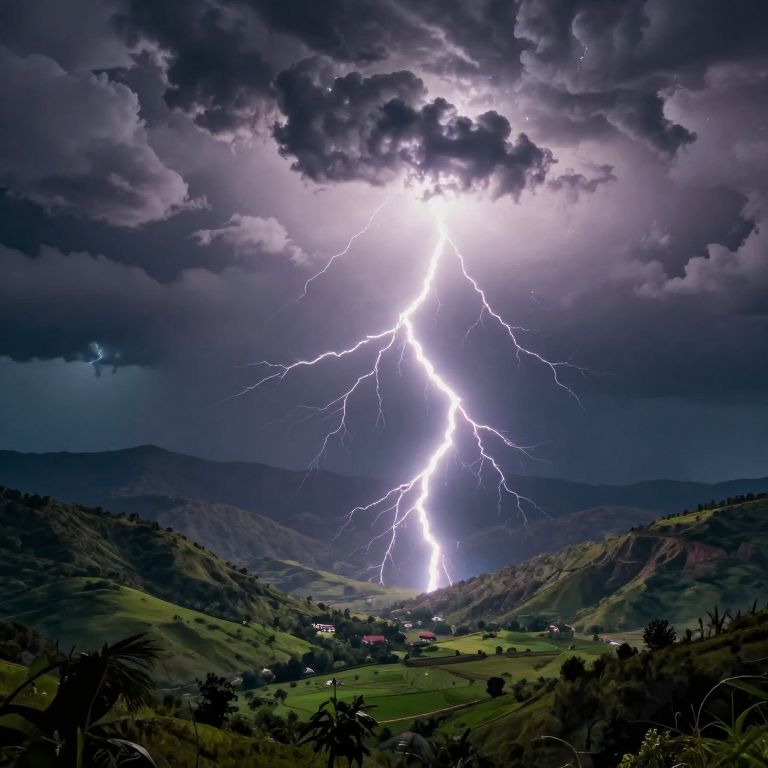 Nature's raw symphony unfolds as sentient clouds compose a celestial ballet, their lightning-struck batons conducting a thunderous crescendo over a verdant valley, where harmony and tension intertwine in a dance of life and power.