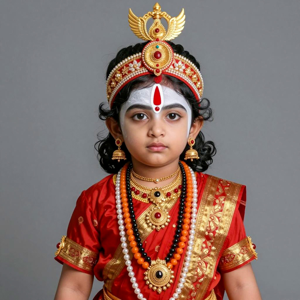 Toddler krishna costume, photorealistic portrait of young child, Indian deity costume, red and gold traditional attire, intricate jewelry, multiple gold necklaces, orange and black bead necklace, red forehead mark, white face paint, black hair in braids, gold and red headgear with winged emblem, serious expression, soft gray background, realistic ures, digital art, detailed makeup, traditional cultural outfit, traditional Indian art style, high contrast colors, realistic lighting