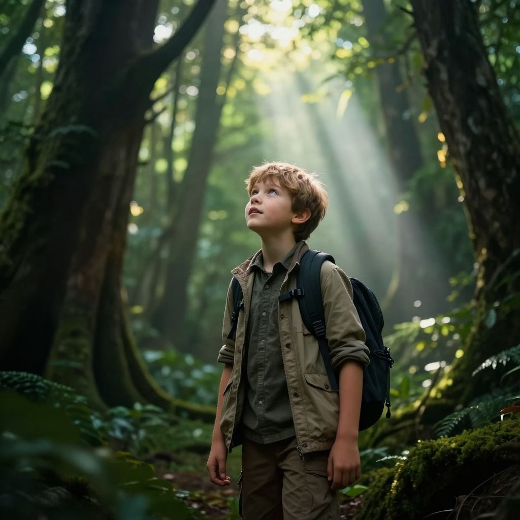 Photograph of a young boy with light brown hair, wearing a green military-style shirt, beige pants, and a black backpack, standing in a dense forest. He gazes upward, sunlight filtering through the tall, dark trees, illuminating the green ferns and leaves around him. The boy's expression is one of wonder and curiosity. The forest is lush, with sunlight rays creating a magical, ethereal atmosphere. The boy is centered in the image, surrounded by the rich textures and shadows of the forest.
