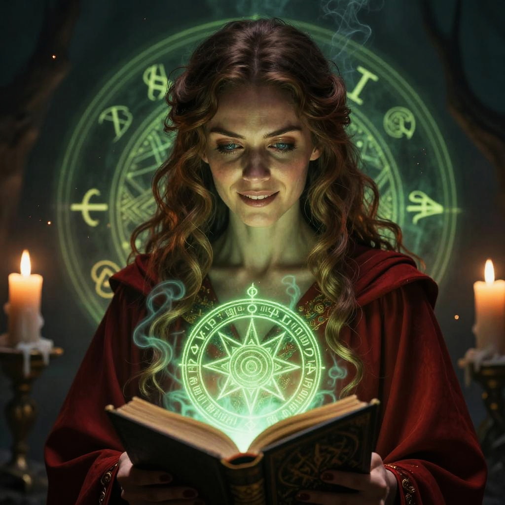 Photograph of a young woman with long, wavy brown hair and fair skin, wearing a red robe. She has intense green eyes and a focused expression, holding an open book with a glowing, green magical circle on its pages. The background features a dark, mystical room with green, glowing runes and symbols on the wall, and two lit candles on either side. The image has a fantasy, magical theme with a high-contrast, ethereal light effect, enhancing the mystical atmosphere.