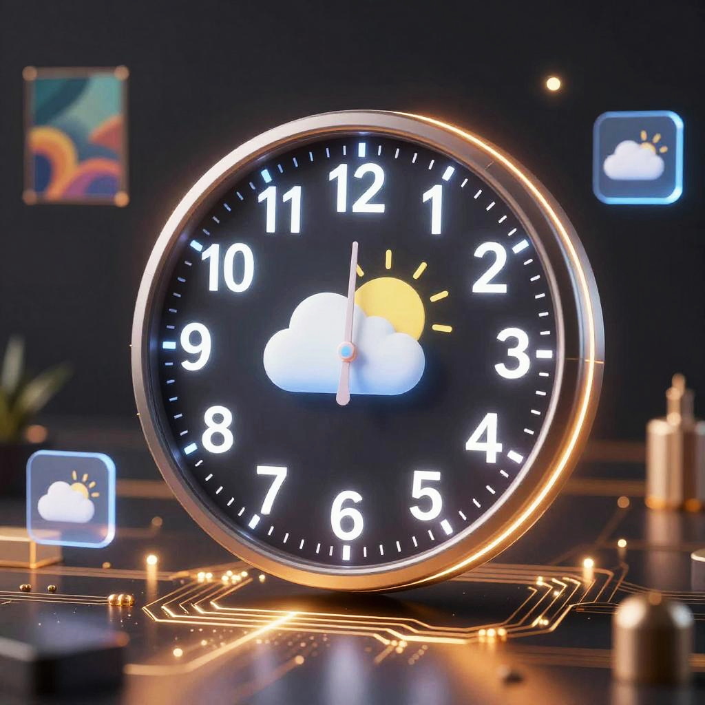 AI clock concept design with smart assistant features, clock face displaying time alongside weather and notifications holographically, surrounded by floating icons and AI-generated abstract art, high resolution, warm glowing light emitting from digital circuits and edges