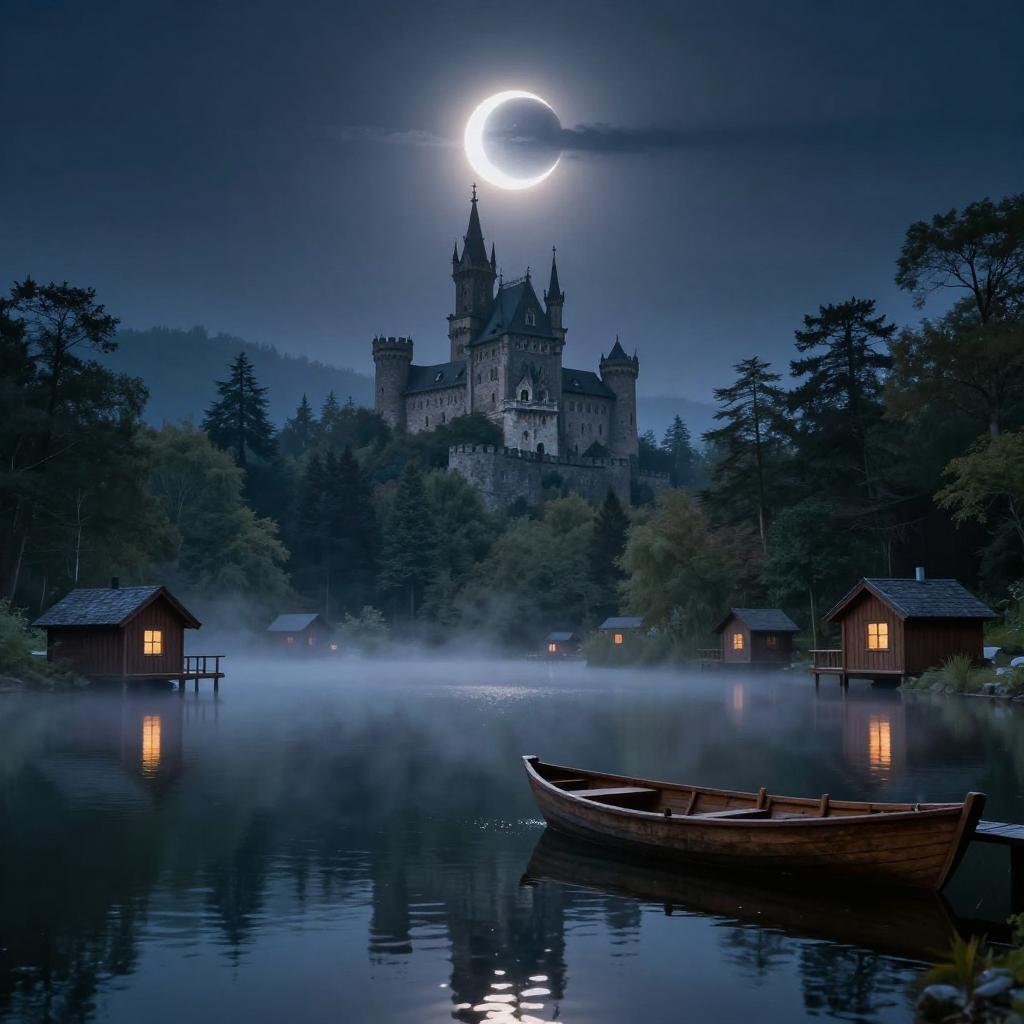 A surreal nighttime scene featuring a mist-covered lake surrounded by dark forest and gothic-style castles in the background. The sky is dominated by a glowing solar eclipse, casting a mysterious blue light over the landscape. Small wooden houses with warm glowing windows are visible near the water's edge, reflected on the calm lake surface. A traditional wooden boat floats gently near the shore amidst the fog.