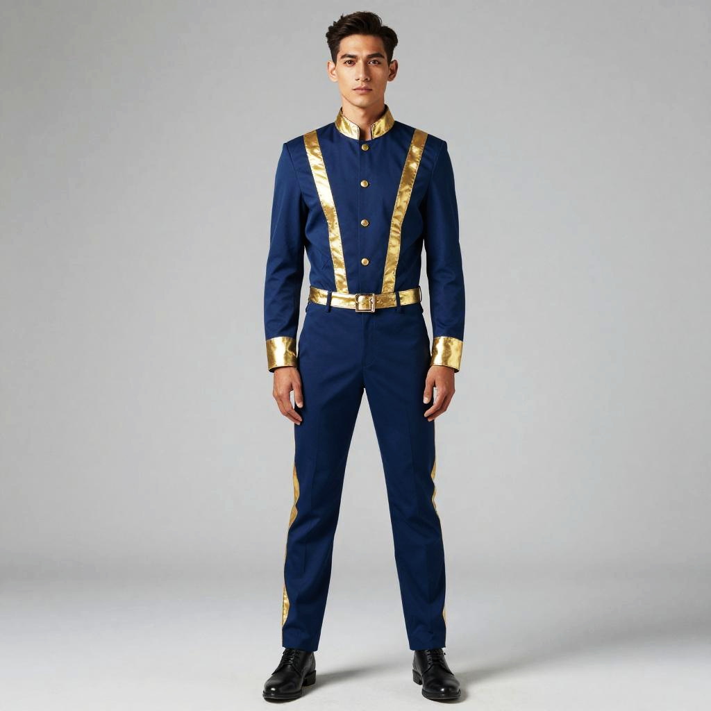 Man Fancy Dress, a man in a blue and gold costume standing in front of a gray background