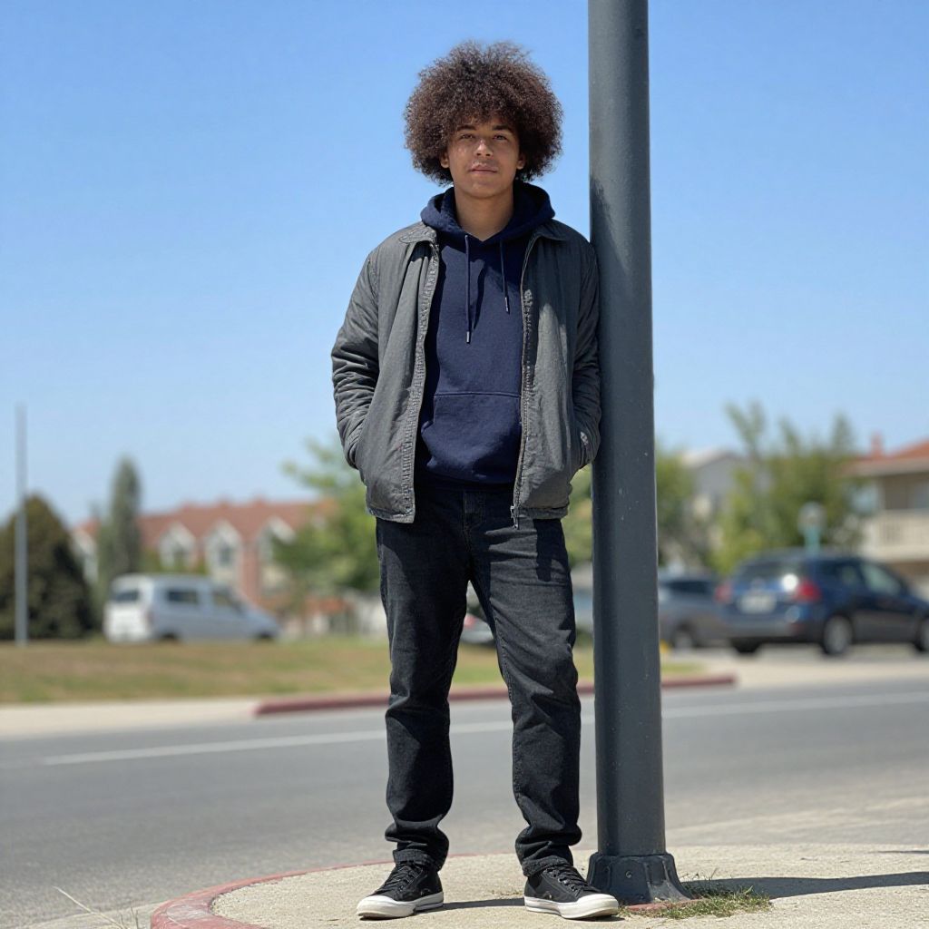 Photograph of a young Black man standing on a street corner, wearing a black hoodie, black jacket, black pants, and black sneakers. He has a large, curly afro and a neutral expression. The background shows a clear blue sky, a few blurred houses, trees, and parked cars. He stands with his hands in his jacket pockets, next to a black street pole. The ground is a mix of concrete and asphalt with a red-painted curb. The image has a shallow depth of field, making the background blurry.