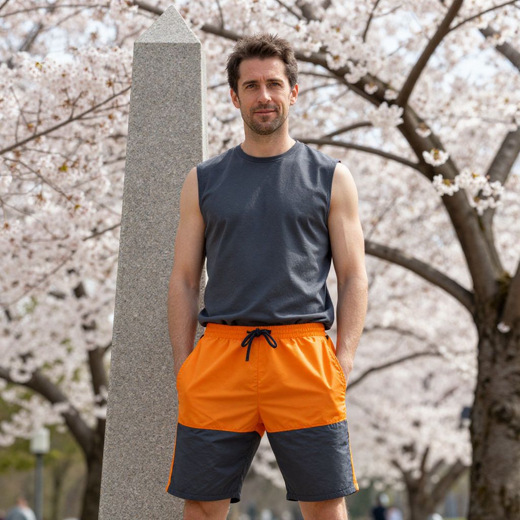Photograph of a fit, light-skinned man with short dark hair and a beard, standing outdoors. He wears a sleeveless navy blue shirt and bright orange athletic shorts with a black drawstring. His hands are in his pockets. Behind him is a tall, grey stone monument and cherry blossom trees in full bloom, with white petals. The sunlight creates a bright, cheerful atmosphere. The man looks directly at the camera with a relaxed expression. The image has a vivid, colorful style.
