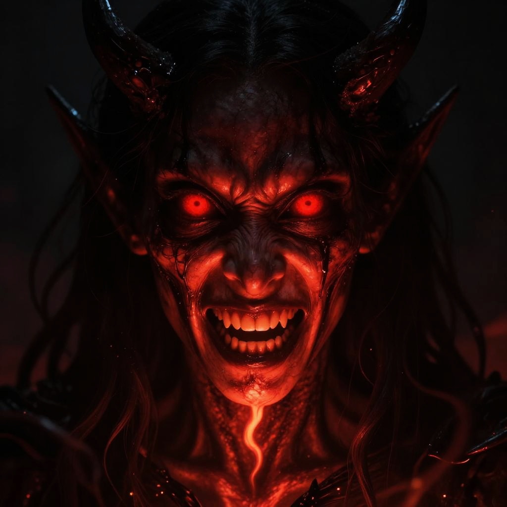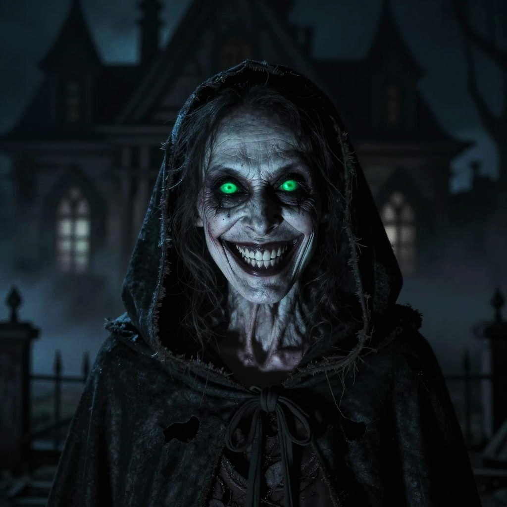 Scary old woman face emerging from foggy forest, twisted features with sharp teeth and glowing red eyes, creepy and unsettling mood, gothic horror style, intense detail