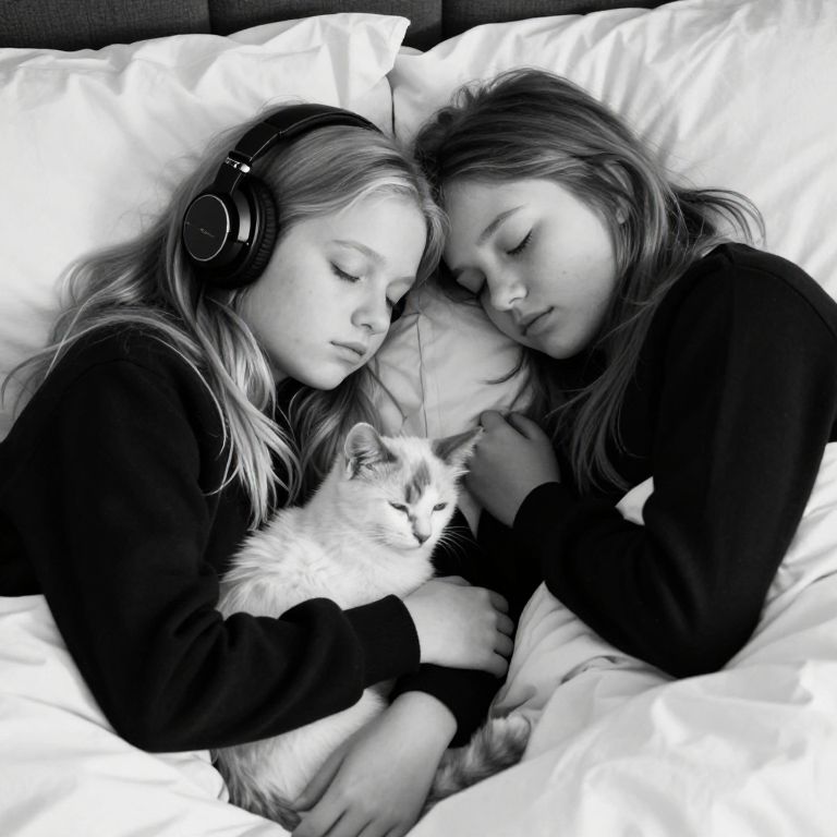 In this black and white photograph, two teenage girls are peacefully sleeping on a bed, their heads resting close together. The girl on the left, wearing headphones and a black jacket, has long blonde hair cascading over her shoulders. She is holding a small, fluffy animal, possibly a cat, in her arms. The girl on the right, also in black clothes, has her eyes closed and appears to be comforted by the presence of the other girl. The bed is covered with soft, white pillows, creating a cozy and intimate atmosphere. The overall composition is warm and serene, capturing a moment of tranquility and companionship between the two girls.