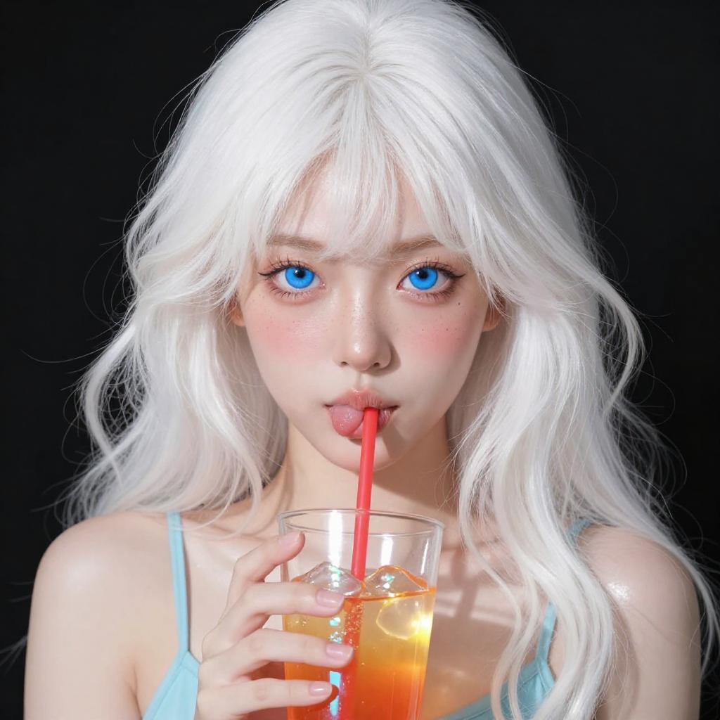 Anime Style Girl with White Hair Drinking Orange Beverage