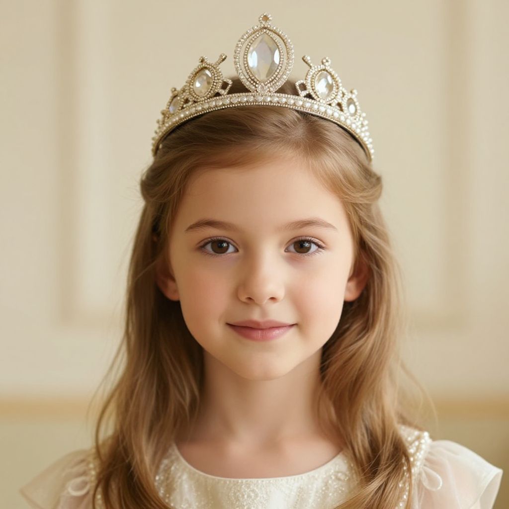 "Zeus Kid, a close up of a young girl wearing a crown and a dress"