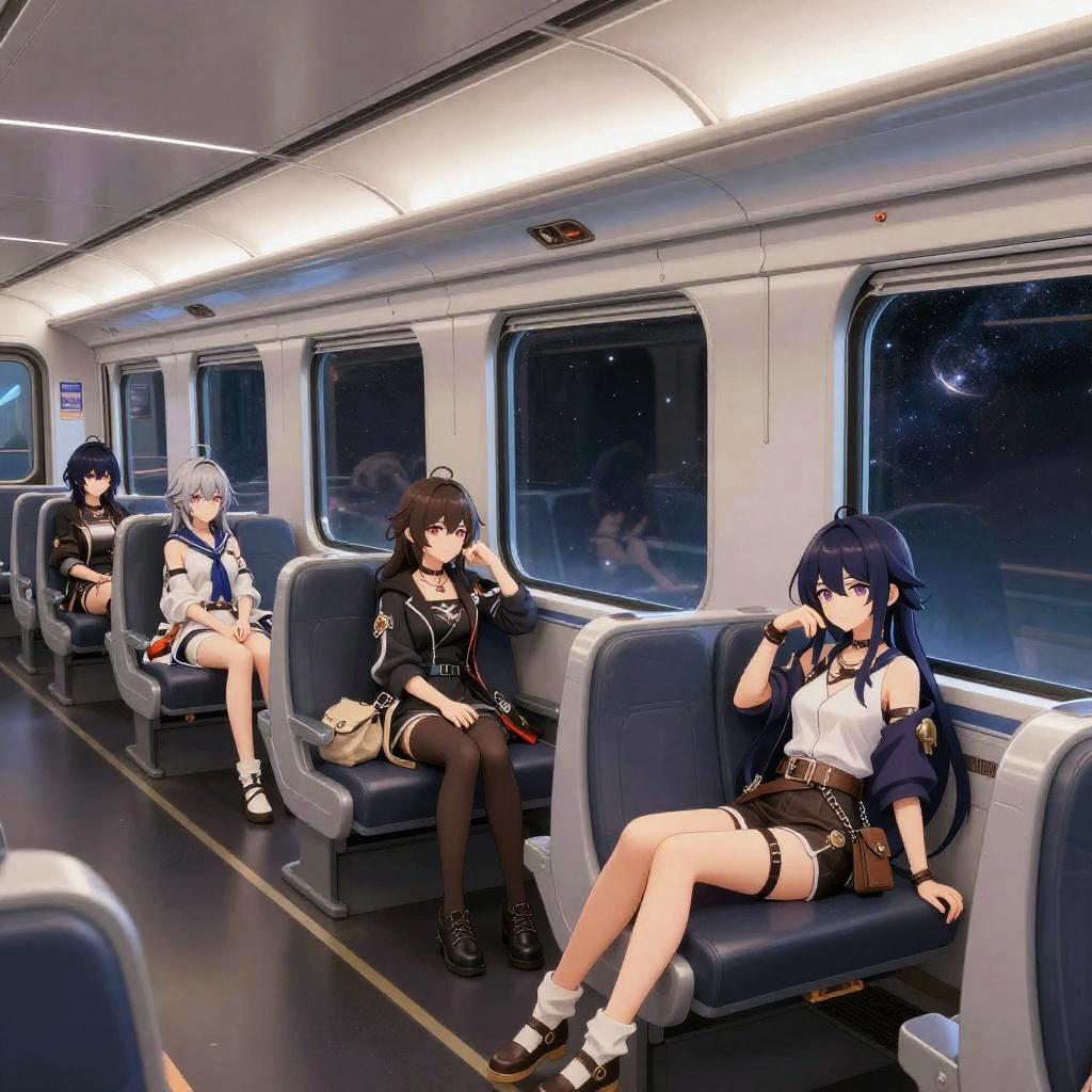 Honkai star rail girls resting inside a sleek interstellar train carriage, cozy yet futuristic interior design with soft lighting, anime style detailed character portraits, casual poses with sci-fi accessories, stars and distant galaxies visible through large panoramic windows