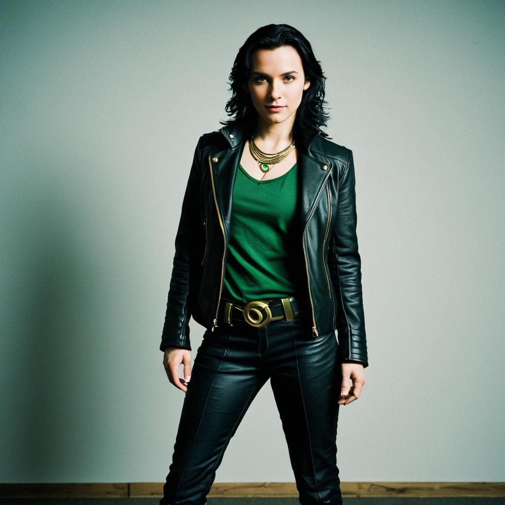Portrait of a confident young woman with black hair wearing a black leather jacket and pants, paired with a green top and a statement gold belt. She accessorizes with layered gold necklaces featuring a green pendant. The plain background emphasizes her bold outfit and direct gaze, capturing a modern, edgy style inspired by Loki's character.