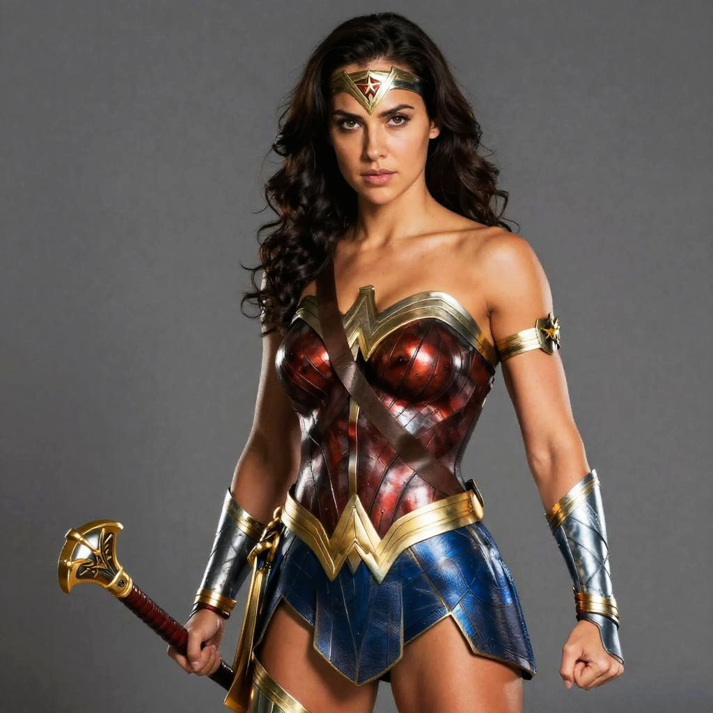 Realistic photo.Wonder Woman superhero character, female, with athletic physique and battle armor. realistic photo