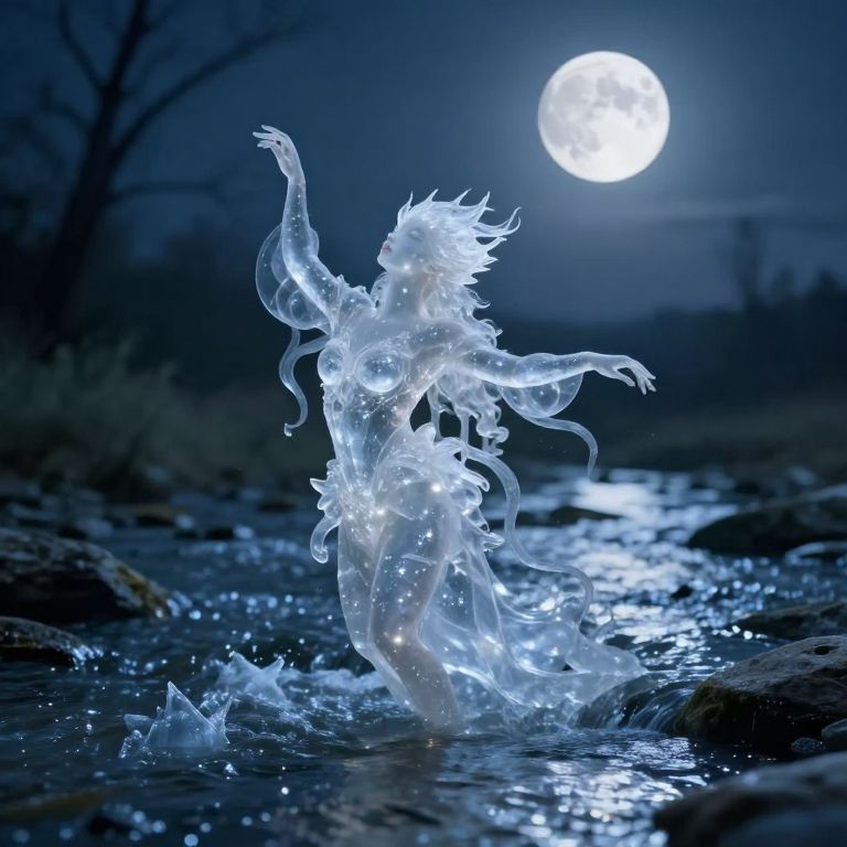 Photograph of a glowing, ethereal, transparent female figure dancing in a moonlit, shallow stream. The figure has flowing, wavy hair and delicate, translucent limbs, resembling a ghost or spirit. The bright full moon in the dark blue night sky illuminates the scene, casting a bluish glow on the figure and water. The background includes blurred, leafless trees and a faint, silhouetted structure. The water reflects the moonlight, creating a shimmering effect. The image exudes a magical, otherworldly atmosphere with its vivid, luminous quality and surreal composition.
