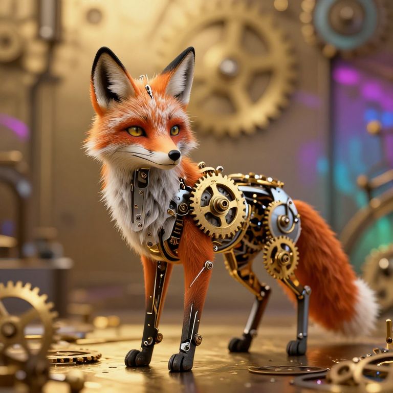 Amidst a kaleidoscope of golden reflections and mechanical whispers, a clockwork fox stands as a paradox of serenity and existential contemplation, its intricate gears symbolizing the delicate dance between order and chaos.