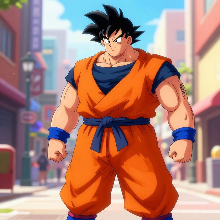 Digital anime-style drawing of muscular Goku in orange gi, blue sash, and wristbands, standing confidently in a sunlit, blurred city street.