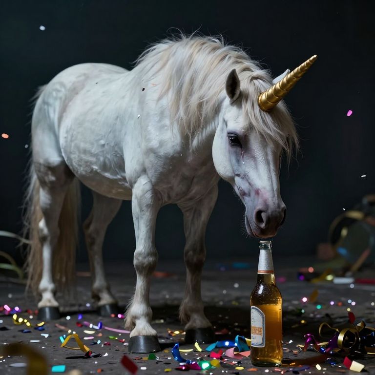 In this hyper-realistic image, a morose, teary, and queasy-looking unicorn stands with a full body, its golden horn and flowing mane contrasting against its pale, unhealthy skin. The unicorn is positioned near a bottle of beer, its head lowered as if in a state of despair or exhaustion. Scattered confetti and party streamers lie on the ground around the unicorn, adding to the chaotic and disheveled atmosphere. The scene is rendered with intricate details, capturing the texture of the unicorn's skin, the reflective surface of the beer bottle, and the shimmering confetti. The composition is tightly framed, focusing on the unicorn and the beer bottle, with the background remaining dark and unobtrusive, emphasizing the central subjects. The overall mood is one of melancholy and excess, evoking a sense of a party gone wrong.