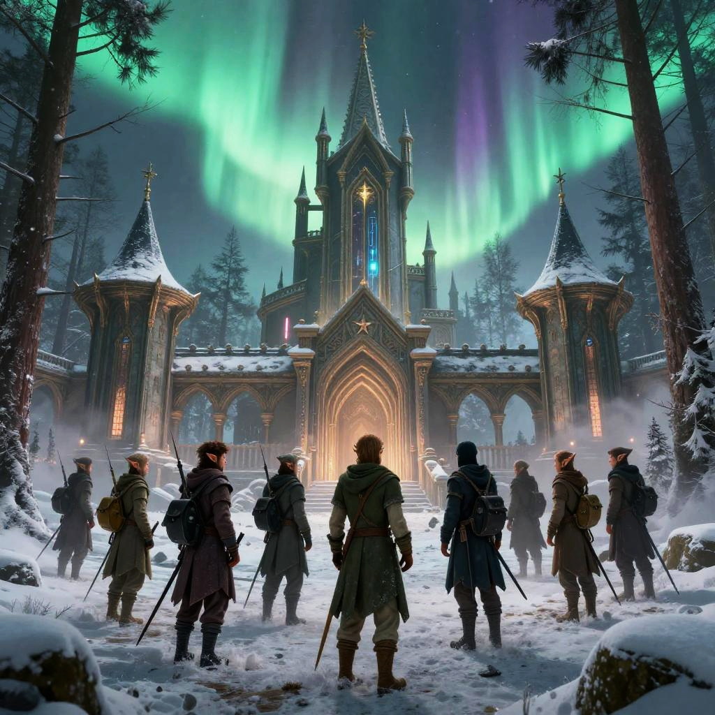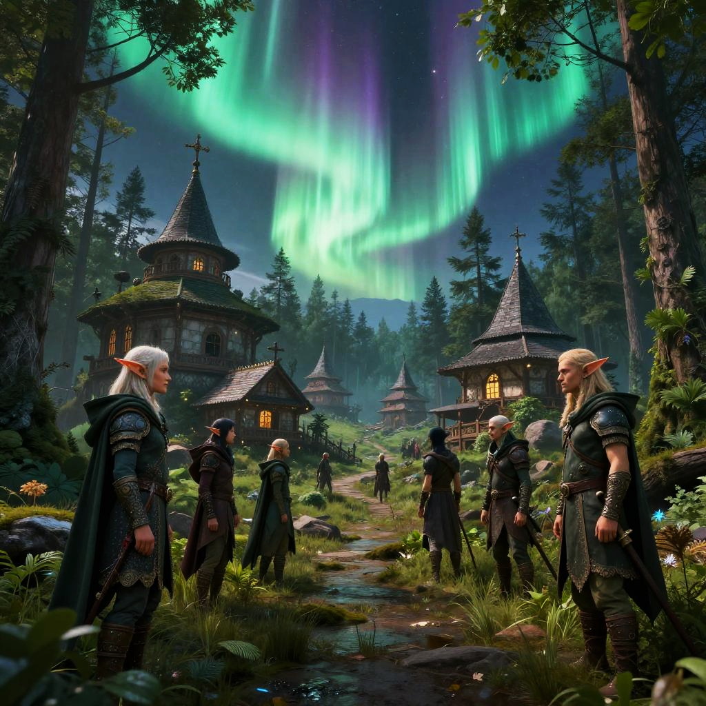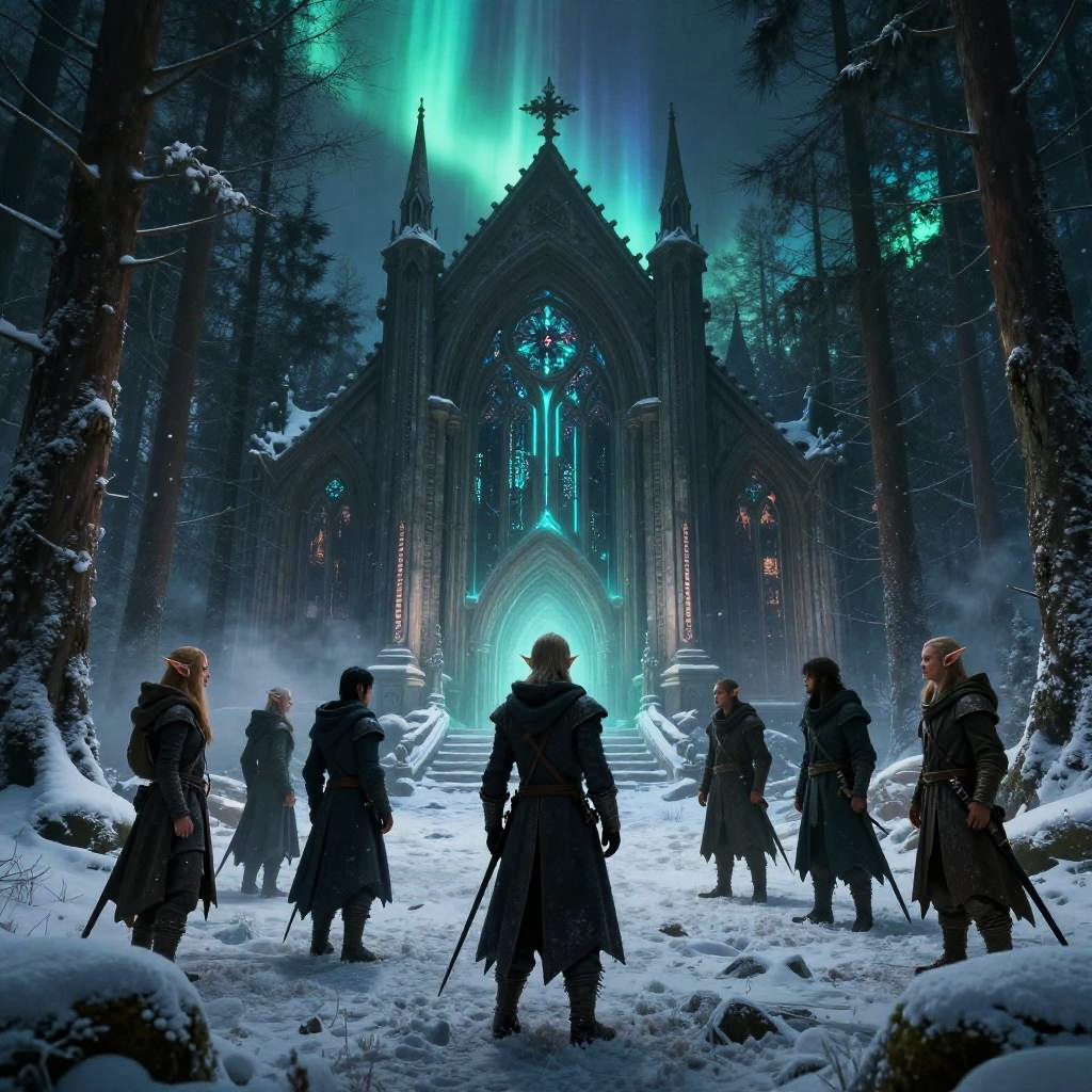 Scene of a group of elves in a winter boreal forest with ornate medieval buildings, cyberpunk fantasy fusion, vivid neon aurora, detailed and realistic, 8k resolution, atmospheric and immersive environment.