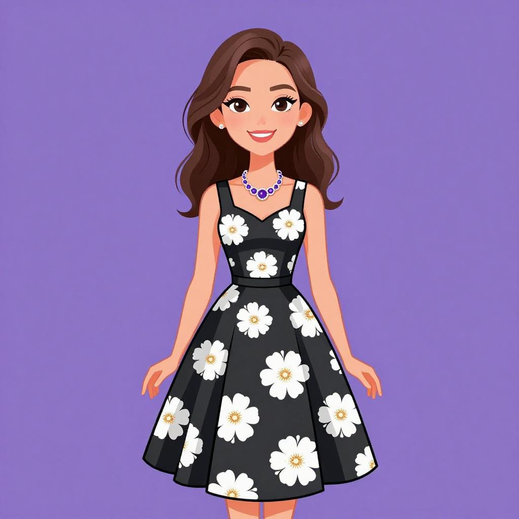 Woman with pretty face and pretty hair. smiling Woman, modern chic, black lace skater dress, sheer mesh yoke, round neckline, sleeveless, fitted bodice, flared skirt, above-knee length, simple black flats, white studio background --sref 1467