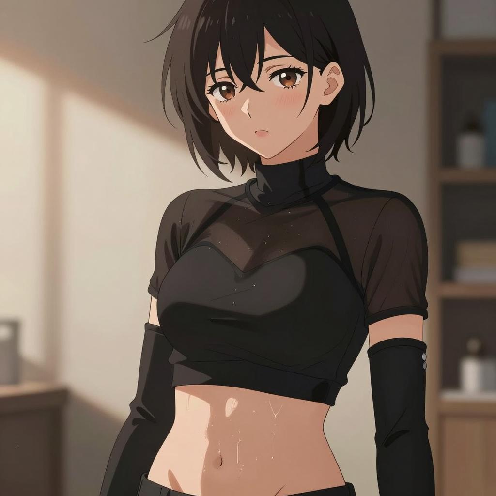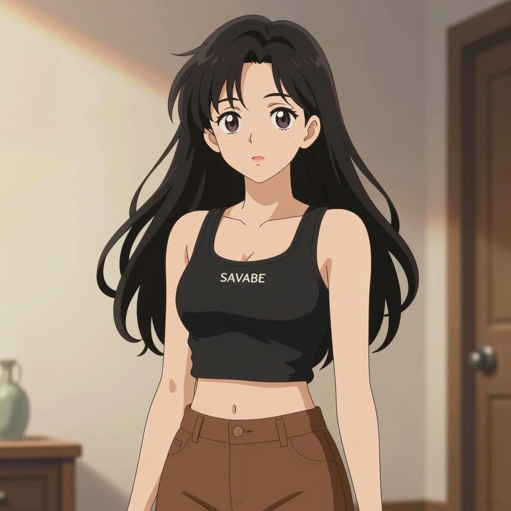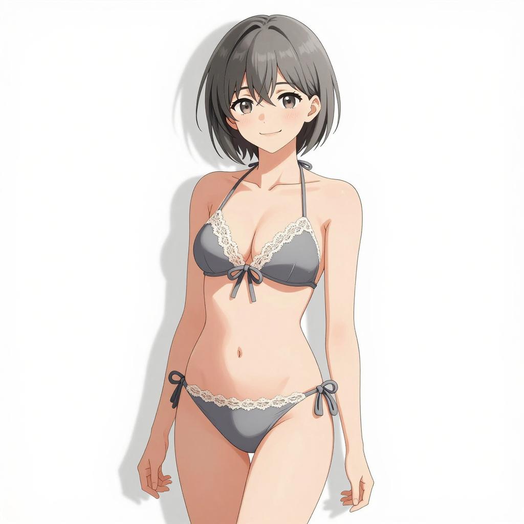 A confident anime girl with long dark hair, wearing a white tank top and gray tactical shorts with a utility belt and holsters, standing in a neutral light gray background, monochrome anime style, clean lines, soft shading