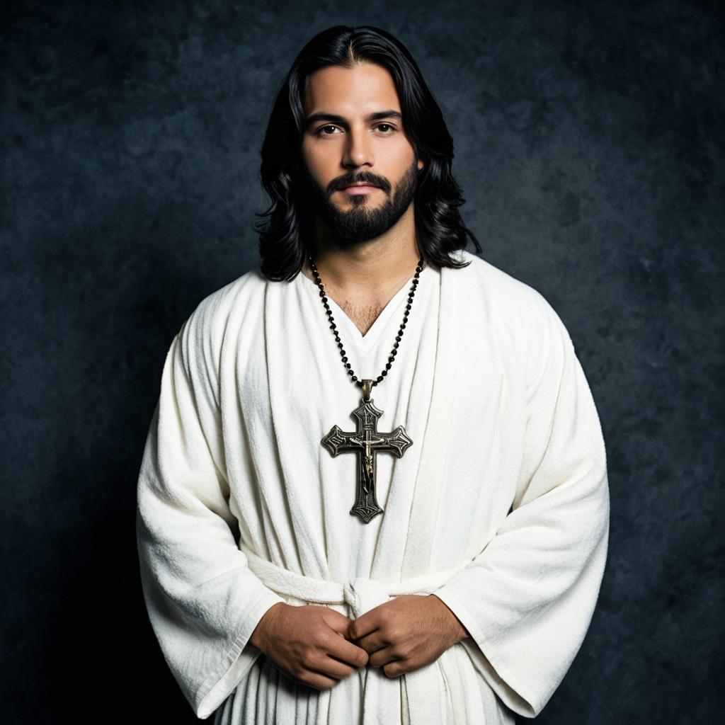 Portrait of a man dressed in a white robe resembling a Jesus Halloween costume. He has long black hair, a beard, and is wearing a large metal cross pendant necklace. The man is standing against a dark textured background, looking directly at the camera with hands loosely clasped in front.