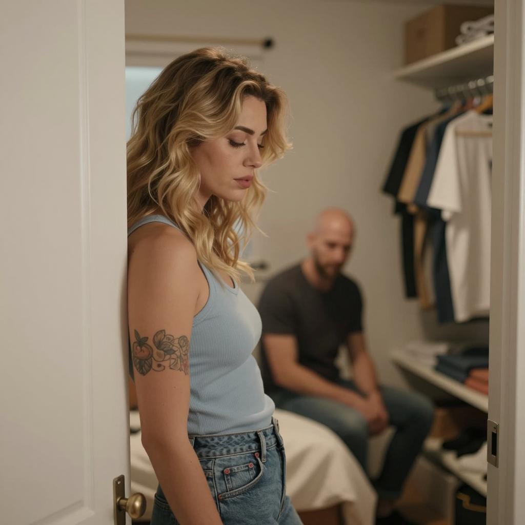 Woman with wavy blonde hair in a light blue sleeveless top leans against a door frame, looking downward. Tattoo on right arm. Background: man with bald head and dark clothing sitting on a bed, blurred. Closet with hanging clothes on the right. Door on the left. Warm lighting.
