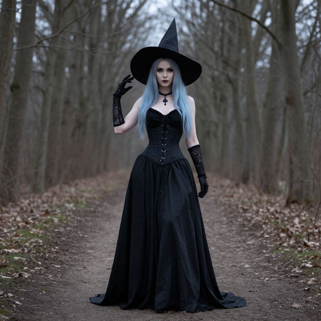 Photograph of a pale-skinned woman with long, bright blue hair standing on a wooded path. She wears a tall, black witch's hat, a black, strapless, corset-style dress with a full skirt, and long, black, lace gloves. A black cross necklace hangs around her neck. Her makeup is dark and gothic, with bold red lipstick. The background features leafless trees and a dirt path lined with brown, fallen leaves. The overall atmosphere is eerie and mystical, with a focus on her gothic, witch-like attire and the overcast, forest setting.